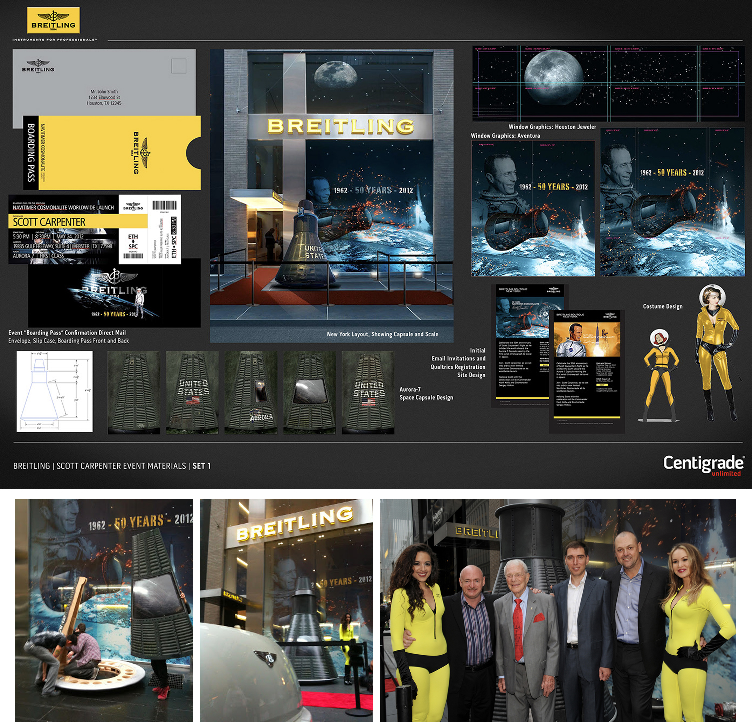 The 50th anniversary of Carpenter's 1962 orbit in the Aurora-7 Mercury capsule and the relaunch of Breitling's Navitimer Cosmonaute. The work below is a window graphic, a 1:1 model of the actual Aurora-7 capsule, and a total event build-out honoring M. Scott Carpenter who wore a Breitling Navitimer Cosmonaute timepiece during his historic 1962 orbital flight around Earth. Also honored at this event were freshly-retired American Flight Commander Mark Kelly, and Russian Cosmonaute Sergey Volov. Breitling hosted the event at their flagship boutique at 57th Street, New York, New York. On May 24, 2012, Swiss watchmaker and our client, Breitling, honored Mr. Scott Carpenter. One of the original pilots who orbited the Earth just prior to the historic moon landing three months later, Mr. Carpenter piloted the Aurora-7 capsule around the Earth three times on May 24, 1962 before splashing down in the ocean. His craft malfunctioned upon re-entry and required him to navigate into Earth's atmosphere completely manually, which was a death-defying and unprecedented feat. Mr. Carpenter's journey through orbit also helped solve the mystery of the Space Fireflies, previously discovered by John Glenn on a previous flight a month earlier. Between these two men, the entire planet was glued to their televisions and radios for news of extraterrestrial life (sparking what we now call the Pulp Sci-Fi era) before learning that the explosive and seemingly sentient balls of fire surrounding the capsules were in fact ice. Check out the Case Study